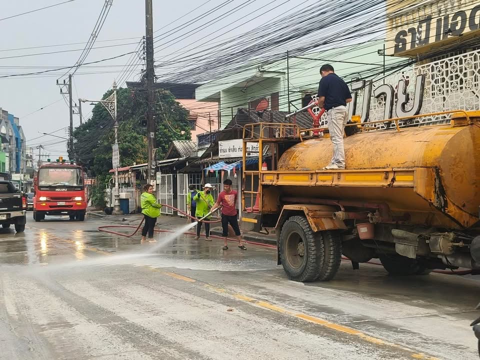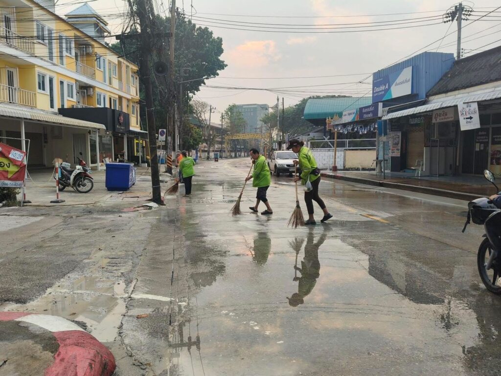 โดยเจ้าหน้าที่ได้ฉีดล้างคราบสกปรก เศษขยะ แป้ง และสิ่งตกค้างจากการเล่นน้ำ พร้อมจัดเก็บขยะอย่างเป็นระบบ เพื่อลดความเสี่ยงในการเกิดอุบัติเหตุ และป้องกันปัญหาด้านสิ่งแวดล้อมในพื้นที่