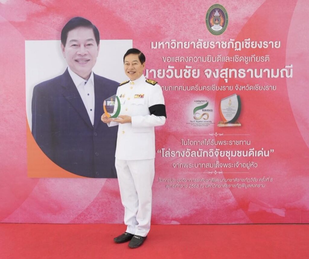 วันที่ 14 กุมภาพันธ์ 2569 นายวันชัย จงสุทธานามณี นายกเทศมนตรีนครเชียงราย เข้ารับรางวัลพระราชทานโล่เชิดชูเกียรติ นักวิจัยชุมชนดีเด่น “ราชภัฏวิจัย” ครั้งที่ 8 นับเป็นจุดกำเนิดแห่งเกียรติยศ ความภาคภูมิใจ และบทบาทสำคัญของสถาบันราชภัฏในการพัฒนาท้องถิ่นอย่างยั่งยืน